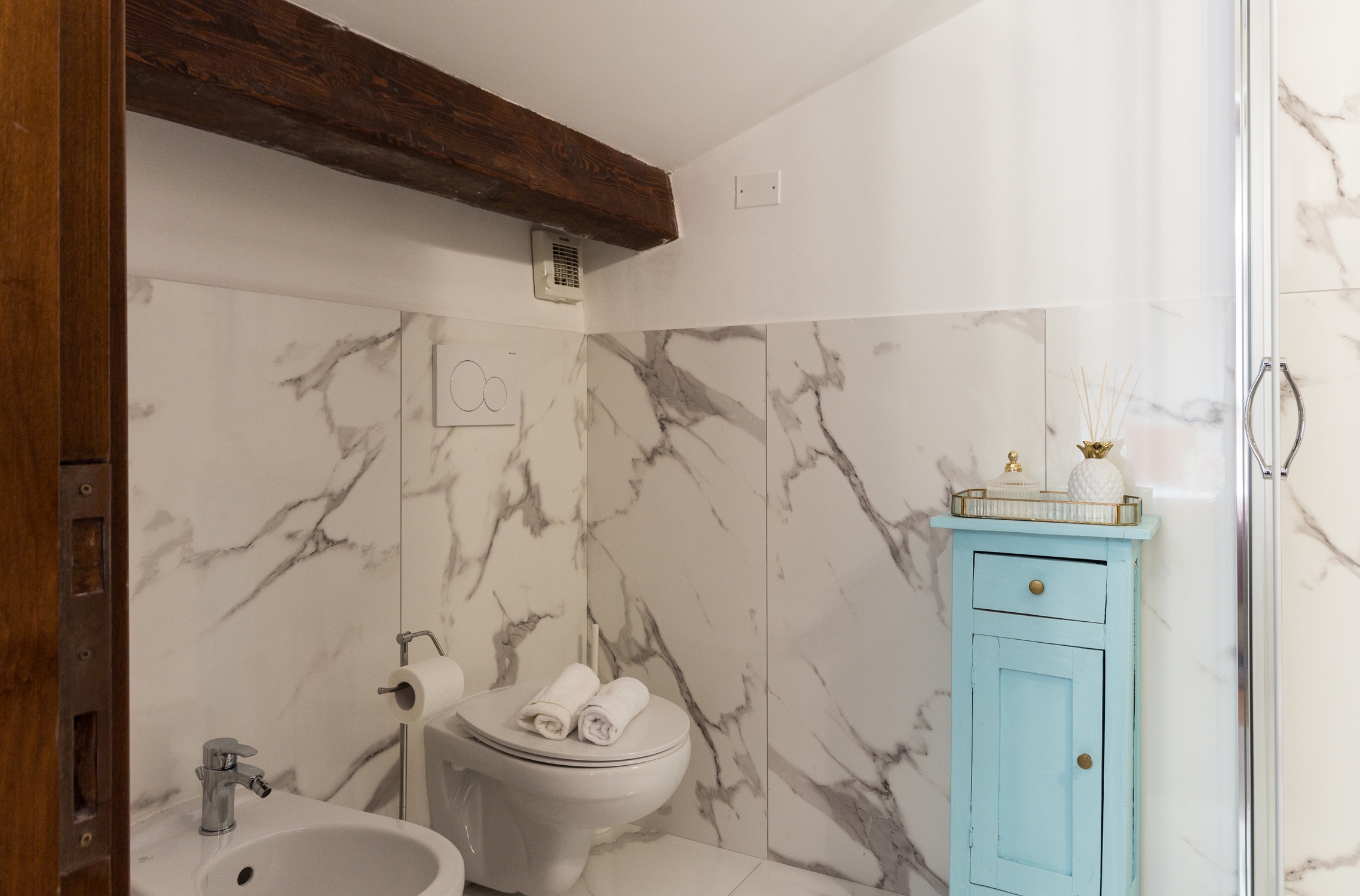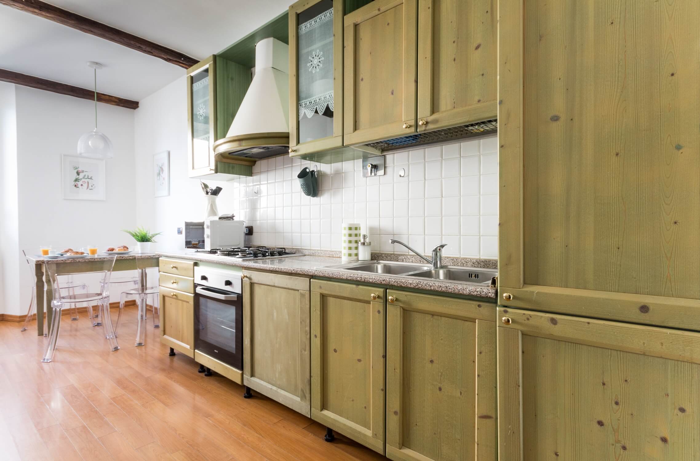 The Executive Suite is a self-contained apartment with its own entrance, mixing the history and tradition of the neighbourhood with a modern touch aimed at young people. The spacious kitchen, equipped with everything you need and a dining table, will allow you to enjoy delicious meals. In addition, we provide our guests with a kettle and a Nespresso machine to start the day with an excellent coffee. Tea and coffee are also included. The two spacious bedrooms are connected via a spiral staircase and are equipped with very comfortable beds to guarantee you a good night’s sleep. The downstairs bedroom can accommodate up to four people thanks to the possibility of adding two extra beds. The newly renovated bathroom with shower cubicle is bright and modern. The flat is equipped with all amenities, including TV, independent heating, air conditioning, free Wi-Fi and a hairdryer. The Executive Suite is the ideal choice for those who wish to immerse themselves in the atmosphere of the ‘Rome of yesteryear’ with a modern touch.
